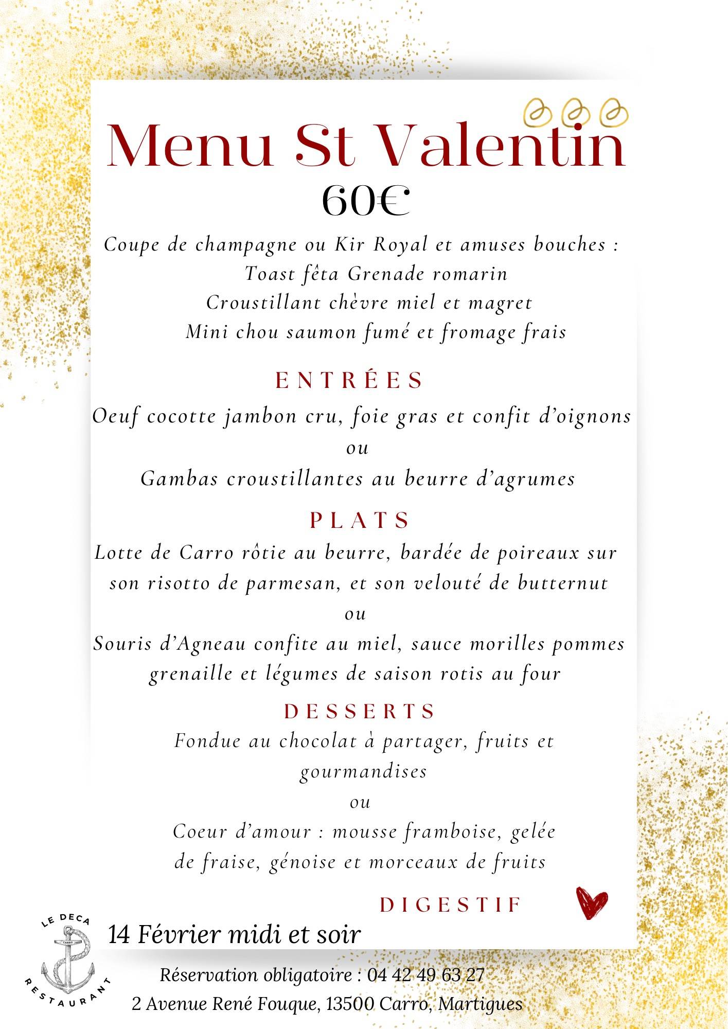 Pour l’occasion, nous vous proposons un menu unique spécial Saint-Valentin, servi le midi et le soir, imaginé avec soin pour vous faire vivre un moment gourmand et raffiné.